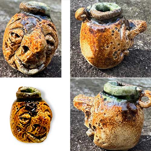 After teaching herself the pottery basics, Celena Schoen began making small beads and pendants for jewelry. Soon the landscape and culture of modern Appalachia found their way into her artwork. In 2014, she made her first miniature versions of traditional southern face jugs. A unique attention to detail immediately caught the attention of face-jug collectors. Her steady hand and patience has earned her recognition as a master of miniatures amongst her peers. She is a detail oriented artist, known for miniature pieces that now are part of the Georgia Art Museum.