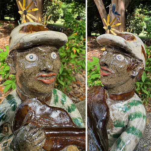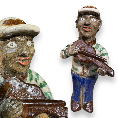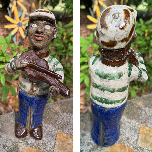 Clint Alderman started making pottery in 1996 at the age of 15. He uses a wood-fired kiln and makes all his glazes with wood ashes and ground glass. Clint makes face jugs and sculptural forms which blend history and tradition with function and art. He uses local dug clay from northeast Georgia and makes each piece by hand on a foot powered treadle wheel.