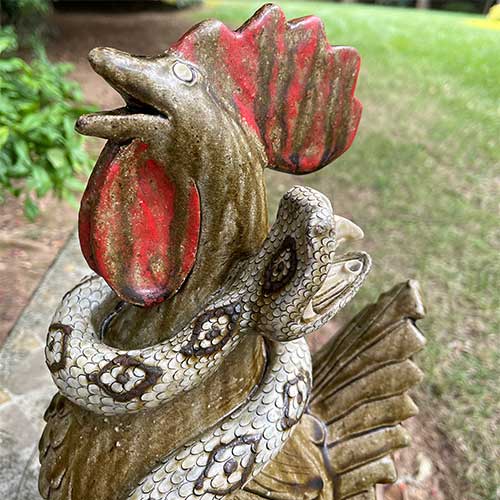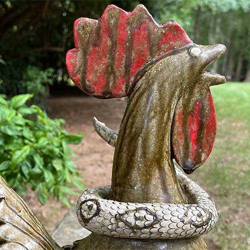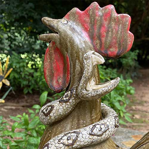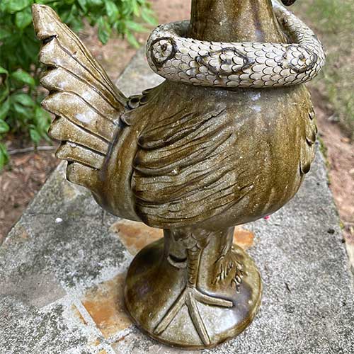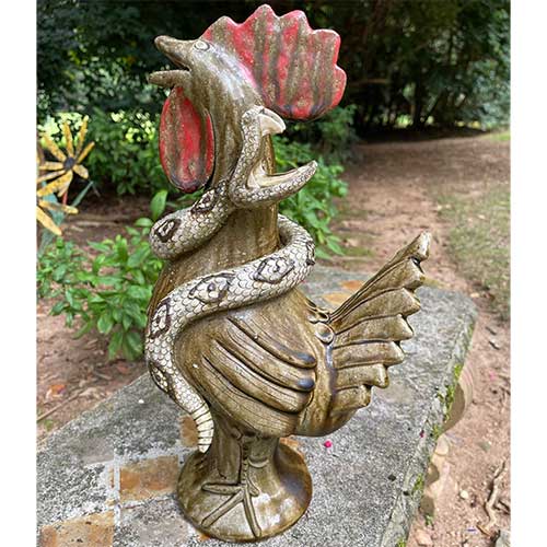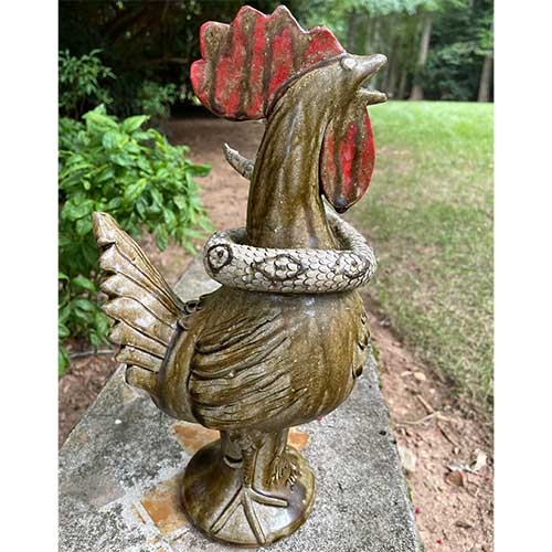 This rooster is 16" tall, 9" wide and has a 5" diameter base.