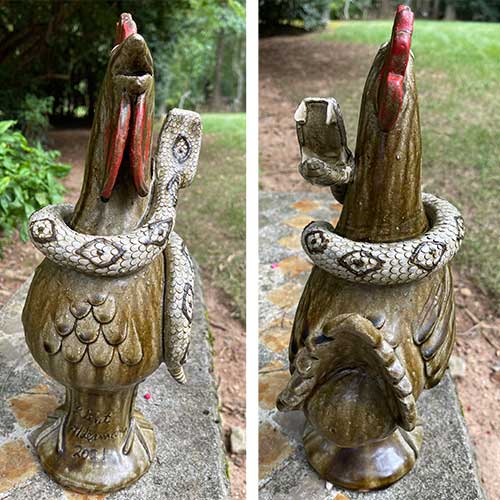 Clint Alderman started making pottery in 1996 at the age of 15. He uses a wood-fired kiln and makes all his glazes with wood ashes and ground glass. Clint makes face jugs and sculptural forms which blend history and tradition with function and art. He uses local dug clay from northeast Georgia and makes each piece by hand on a foot powered treadle wheel.