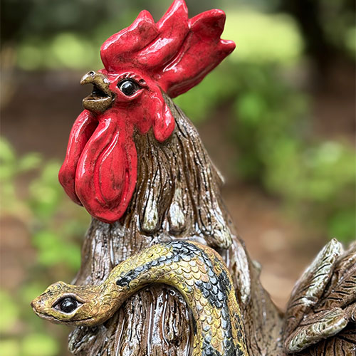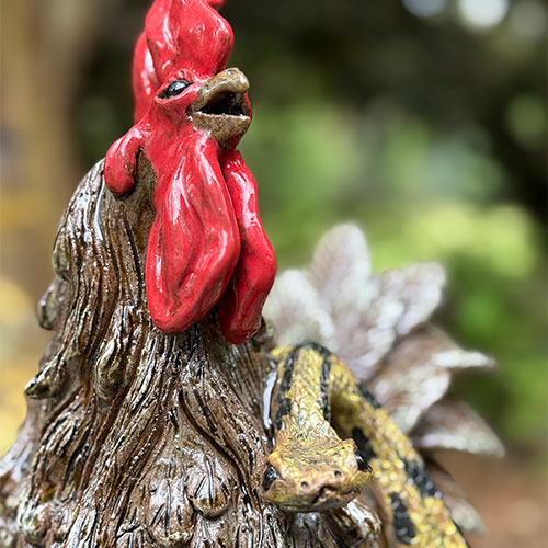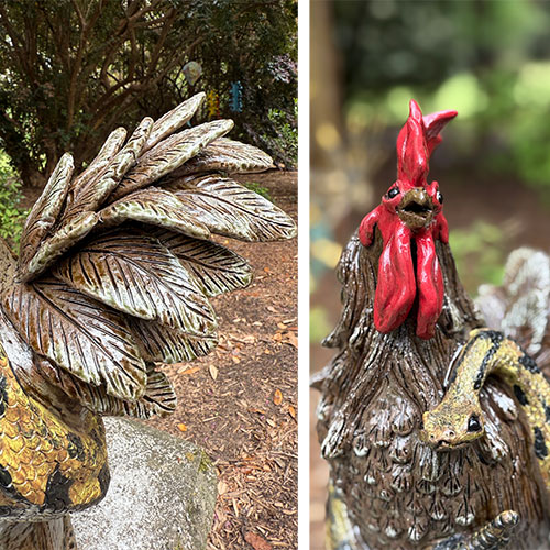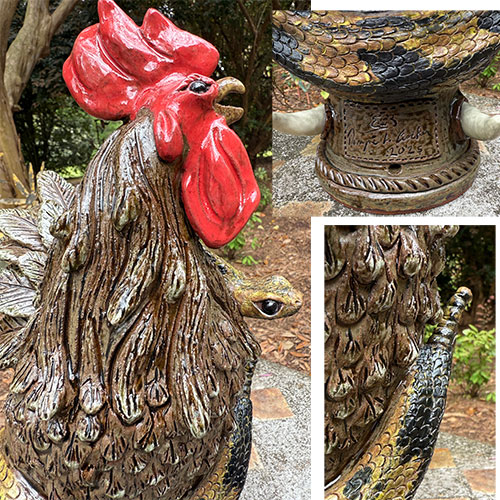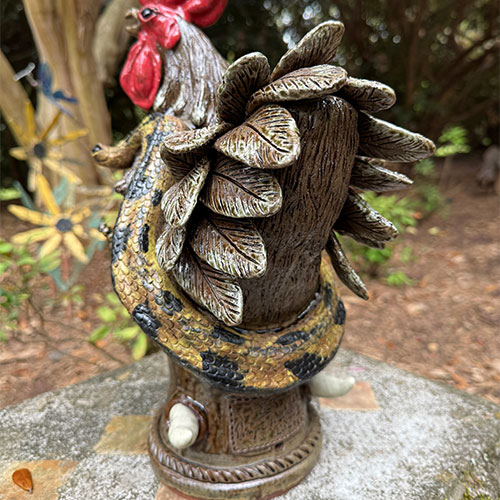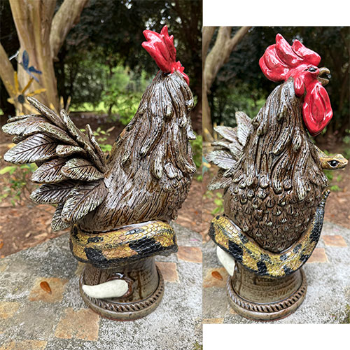 Dwayne Crocker strives to follow the generations old traditions characteristic of Southern folk art pottery starting from the ground up. He uses Georgia red clay, mixes glazes, and strains ashes for his glazes. He uses time honored methods, concepts, tools (a straw and a nail) and designs, just as the old timers before him.