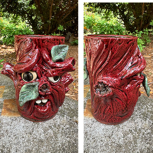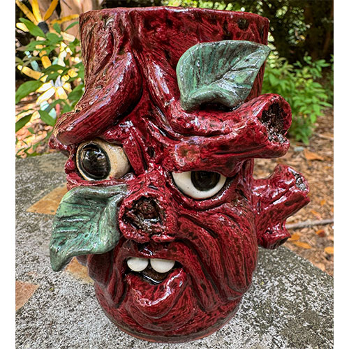 Dwayne Crocker strives to follow the generations old traditions characteristic of Southern folk art pottery starting from the ground up. He uses Georgia red clay, mixes glazes, and strains ashes for his glazes. He uses time honored methods, concepts, tools (a straw and a nail) and designs, just as the old timers before him.