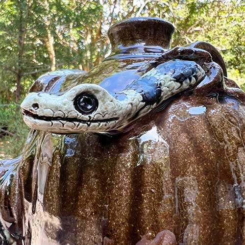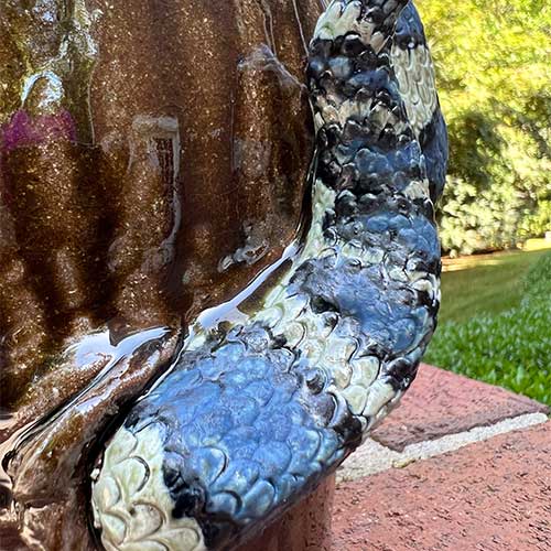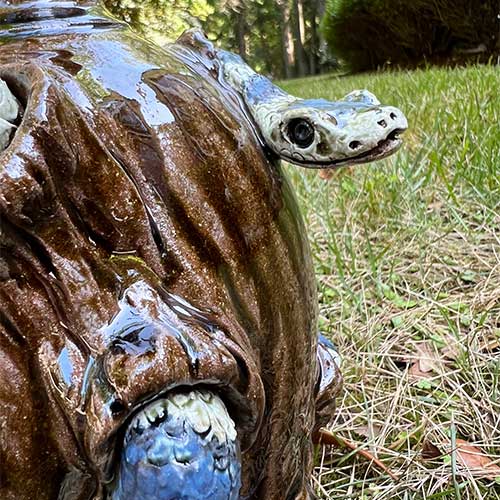 Dwayne Crocker strives to follow the generations old traditions characteristic of Southern folk art pottery starting from the ground up. He uses Georgia red clay, mixes glazes, and strains ashes for his glazes. He uses time honored methods, concepts, tools (a straw and a nail) and designs, just as the old timers before him.