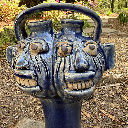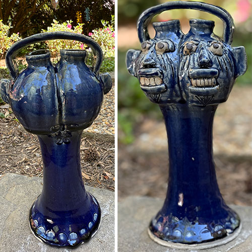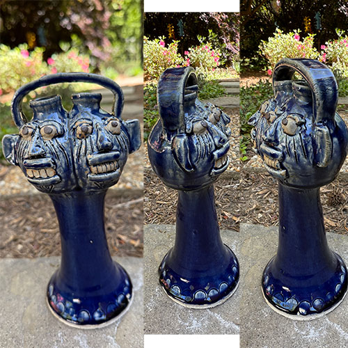 Here's a wood fired twin pedestal face jug by Catawba potter Ed Lane. 10" tall, 5.5" wide, with a 4" base
