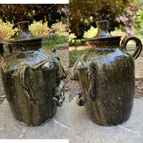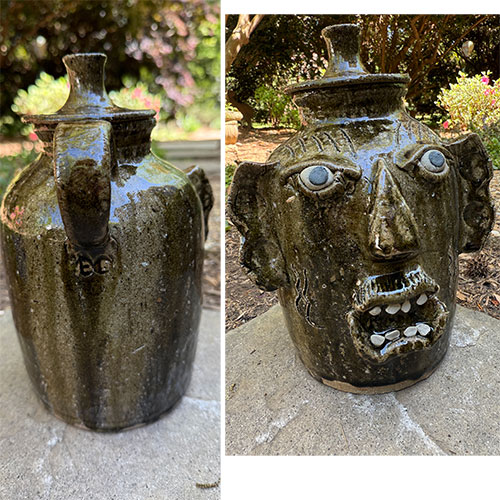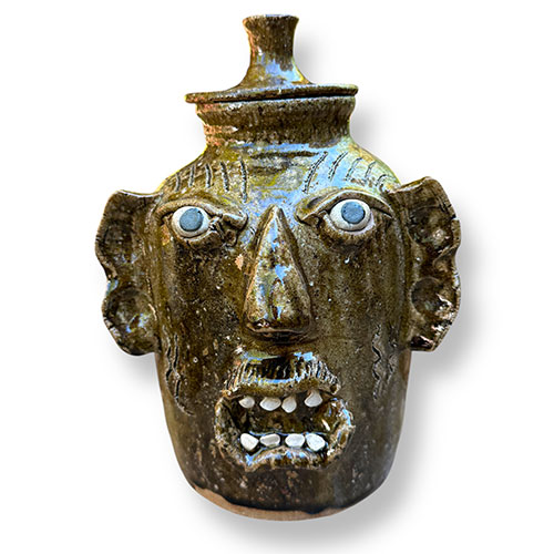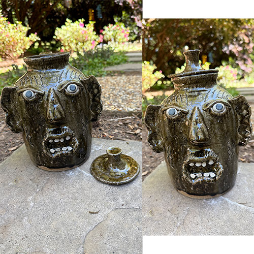 Here's a wood fired lidded face container by Catawba potter Ed Lane. 10.5" tall with lid, 8.5" without. 8" wide, with a 5.25" base