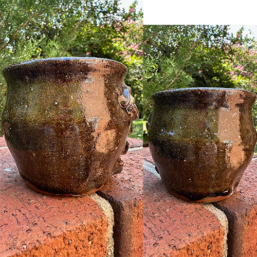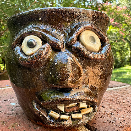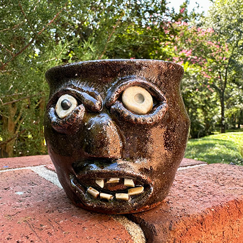 Eric Holder started turning pottery in 2006 in Lenoir, NC in a small studio along side his instructor with the thought of functional ware, such as bowls, cups and pitchers. He quickly learned about the Catawba Valley pottery tradition. His interest was immediately intrigued by the hand dug clay, natural alkaline glazes and the ground hog kiln firing process. Today's pieces include face jugs, crocks, monkey jugs, pedestal heads and various other items. He puts thought into each individual piece trying to make each one as unique as possible. Most of his work is wood fired.