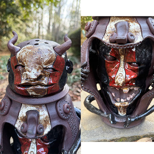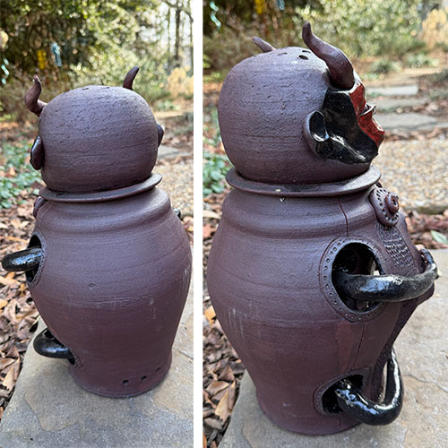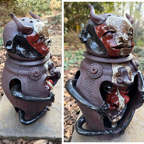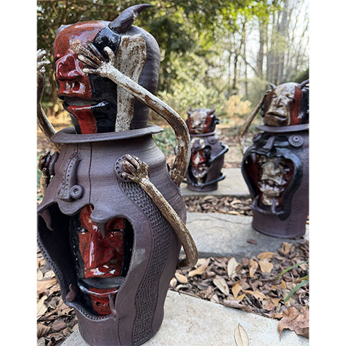 These sculptural face jugs by Feliciano push the traditional form into bold, contemporary territory. Each piece is built as a layered vessel, combining horned or helmeted figures with articulated arms and openings that reveal inner faces and skeletal forms. Rich, earthy glazes of red, black, and brown heighten the sense of tension between exterior strength and interior vulnerability. Both confrontational and deeply expressive, these works stand as powerful examples of how the face jug tradition continues to evolve in the hands of a contemporary artist.