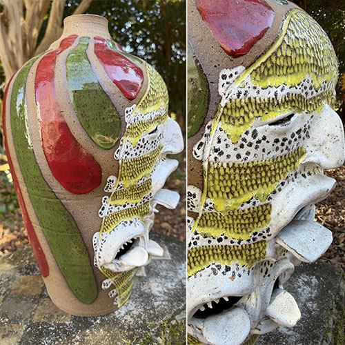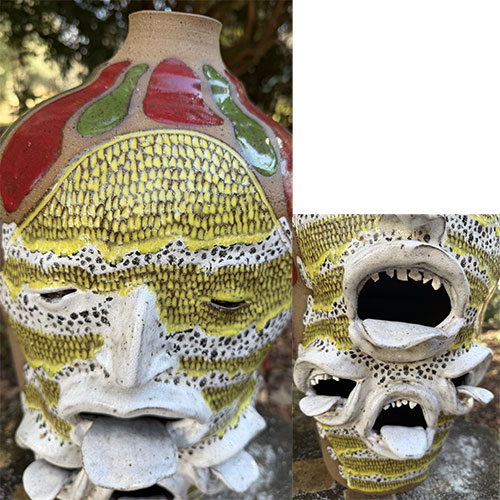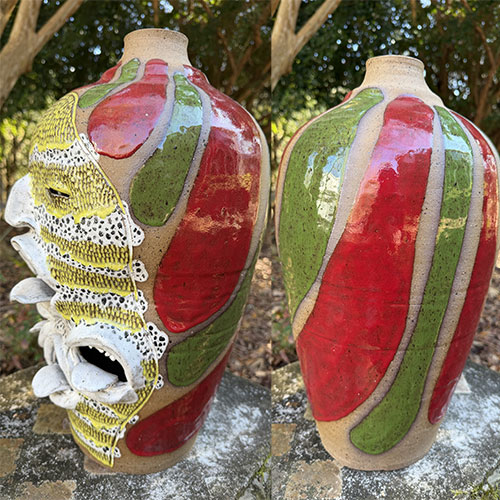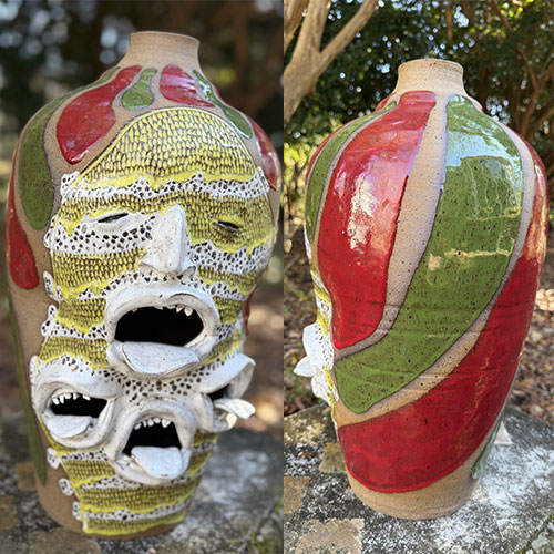 This dynamic jug showcases the artist’s inventive approach to form, surface, and narrative within contemporary Southern ceramics. Handbuilt in stoneware, the vessel features a striking stacked composition of multiple expressive faces cascading down the front—each with open mouths and exaggerated features that create a rhythmic, almost totemic vertical flow. The surface is richly layered with contrasting textures and glazes. A combination of patterned, tactile slip work and high-gloss color fields in red, green, and yellow creates a bold visual interplay between matte and shine. The dotted and linear surface detailing adds depth and movement, while the bright, segmented glaze areas wrap the form, reinforcing its sculptural presence from every angle. At 18 inches tall, this work is substantial yet versatile—equally suited for display as a focal point in a collection of Southern pottery, outsider art, or contemporary ceramic sculpture. It stands out for its complexity, color, and unmistakable individuality.