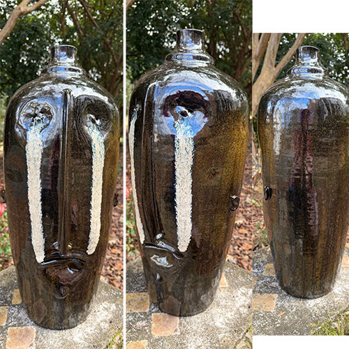 At 23 inches tall, this commanding vessel reads as both pottery and sculpture—an evocative statement piece that bridges traditional face jug heritage with modern ceramic expression. Ideal for collectors of Southern pottery, contemporary folk art, and sculptural ceramics, this work stands out for its emotional presence and striking visual contrast.