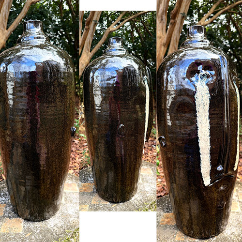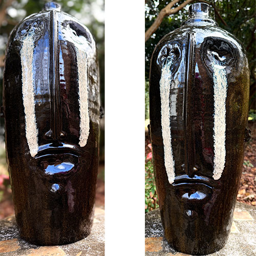 This powerful 23-inch sculptural face jug features a haunting “crying eyes” motif rendered in thick vertical streams of white glaze flowing from deeply set eye sockets. The tears cascade down the dark, glossy stoneware surface, creating dramatic contrast and emphasizing the emotional intensity of the piece. Abaurre’s interpretation of the face jug tradition blends contemporary sculptural sensibility with the symbolic language often found in Southern folk ceramics. The elongated tears become both visual focal point and narrative device, suggesting themes of sorrow, endurance, and human vulnerability. The simplicity of the facial features heightens the impact of the gesture, making the flowing glaze appear almost alive.