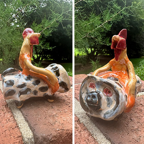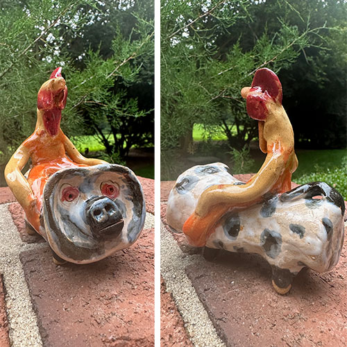 This piece is by Mary Ferguson. She has a pretty amazing sense of humor and it is put on display here. This taxi pig 5" tall, 3.5" from nose to tail and 2" deep. You receive the sculpture pictured.