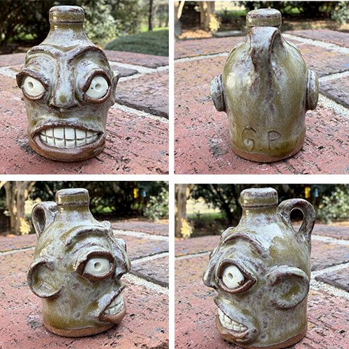 Drawing influence from the historic Edgefield District pottery tradition, these small-scale works retain the defining characteristics of their larger counterparts—bulging eyes, sculpted features, and animated expressions—while embracing the spontaneity that comes with working at a reduced scale. Each jug is individually formed and finished in a range of earth-toned and alkaline-style glazes, from deep browns to lighter, variegated surfaces. Subtle differences in facial structure, glaze movement, and surface texture make every piece distinct, reinforcing their identity as one-of-a-kind studio works. Despite their size, these miniatures carry a strong visual and cultural presence, functioning as both accessible entry points for new collectors and compelling additions to established collections of Southern folk pottery and contemporary face jugs. Together, they form a dynamic grouping that highlights Patton’s ability to translate tradition into small, expressive forms.