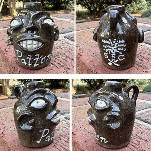 This miniature face jug distills the expressive qualities of larger Southern face vessels into a highly compact form. Despite its scale, the piece retains bold facial features—raised eyes, a defined mouth, and sculpted cheeks—executed with clarity and precision. Finished in a dark, glossy glaze, the jug carries a strong visual presence, while the handwritten “Patton” signature adds a personal, studio-made quality. The reverse includes a simple decorative motif, reinforcing its identity as both object and artifact. Small in size but rich in character, this miniature serves as an accessible entry point for collectors, or as a complementary piece within a broader face jug or Southern folk pottery collection.