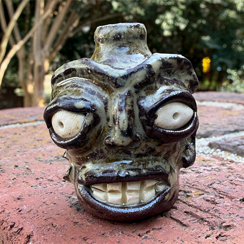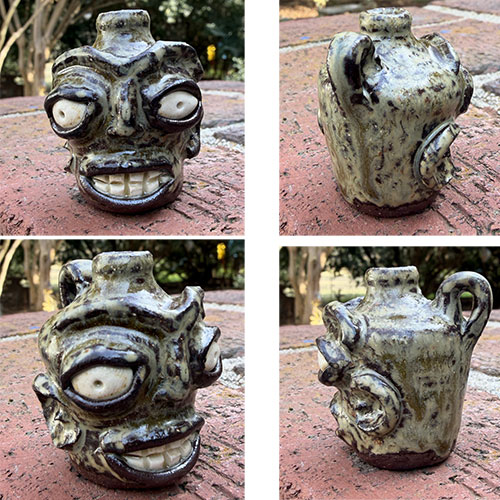 Drawing influence from the historic Edgefield District pottery tradition, these small-scale works retain the defining characteristics of their larger counterparts—bulging eyes, sculpted features, and animated expressions—while embracing the spontaneity that comes with working at a reduced scale. Each jug is individually formed and finished in a range of earth-toned and alkaline-style glazes, from deep browns to lighter, variegated surfaces. Subtle differences in facial structure, glaze movement, and surface texture make every piece distinct, reinforcing their identity as one-of-a-kind studio works. Despite their size, these miniatures carry a strong visual and cultural presence, functioning as both accessible entry points for new collectors and compelling additions to established collections of Southern folk pottery and contemporary face jugs. Together, they form a dynamic grouping that highlights Patton’s ability to translate tradition into small, expressive forms.