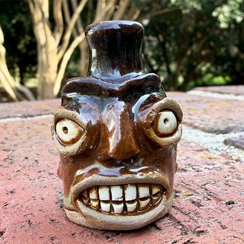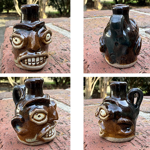 Drawing influence from the historic Edgefield District pottery tradition, these small-scale works retain the defining characteristics of their larger counterparts—bulging eyes, sculpted features, and animated expressions—while embracing the spontaneity that comes with working at a reduced scale. Each jug is individually formed and finished in a range of earth-toned and alkaline-style glazes, from deep browns to lighter, variegated surfaces. Subtle differences in facial structure, glaze movement, and surface texture make every piece distinct, reinforcing their identity as one-of-a-kind studio works. Despite their size, these miniatures carry a strong visual and cultural presence, functioning as both accessible entry points for new collectors and compelling additions to established collections of Southern folk pottery and contemporary face jugs. Together, they form a dynamic grouping that highlights Patton’s ability to translate tradition into small, expressive forms.