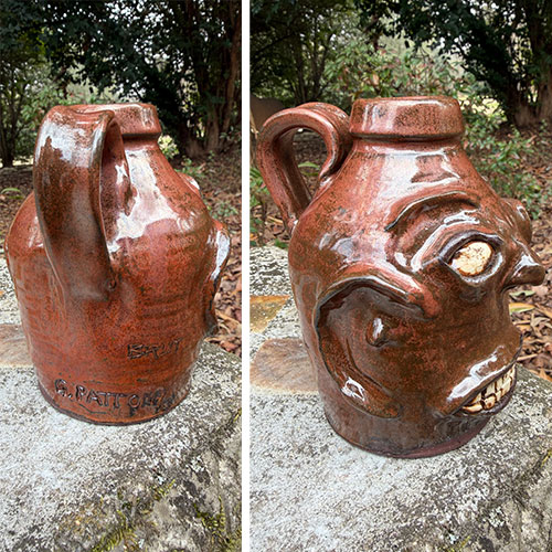 This Greg Patton face jug is finished in a striking deep red-brown glaze, creating a glossy, reflective surface that accentuates the jug’s bold facial features. The arched brows, rounded eyes, and tightly formed mouth give the piece a focused, slightly intense expression. The traditional jug form, complete with handle and narrow neck, ties the work to the Edgefield pottery lineage, while the saturated glaze introduces a more contemporary visual weight. Subtle tonal shifts within the glaze enhance the contours of the face, reinforcing its sculptural presence.