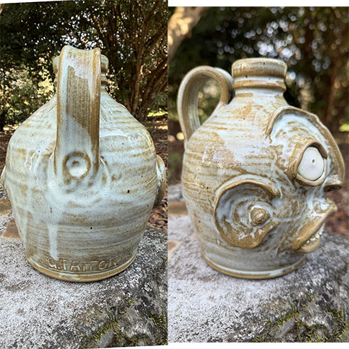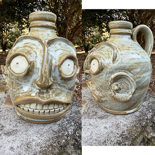 This piece draws directly from the historic Edgefield District pottery tradition, where expressive face vessels emerged as both functional forms and culturally symbolic objects. Patton interprets that lineage through a lighter, alkaline-style glaze, giving the piece a softer, almost atmospheric surface while maintaining strong sculptural definition. The jug features wide, protruding eyes, a pronounced nose bridge, and a tightly gridded toothy mouth, all modeled with deliberate exaggeration. The lighter glaze pools and breaks across the surface, emphasizing contours and lending a sense of age and movement reminiscent of traditional Edgefield wares.