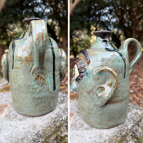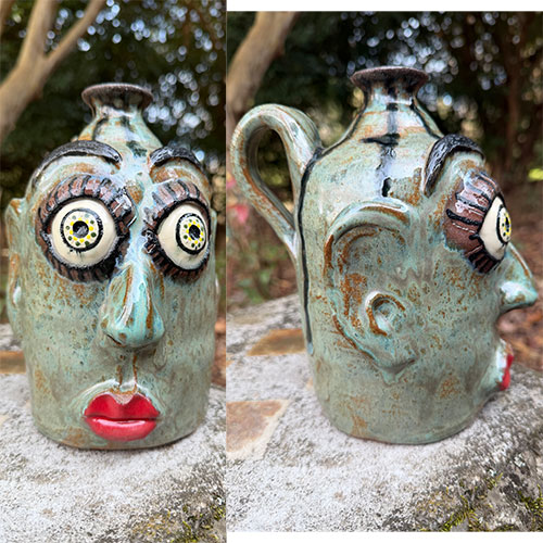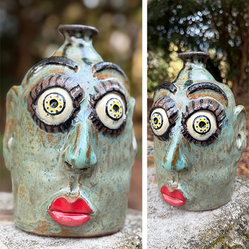 Heather Elyse Head says, "My favorite thing about my art is that it often makes people smile when they see it. I love to use bold colors and whimsical, exaggerated features on my face jugs and other pottery pieces.”