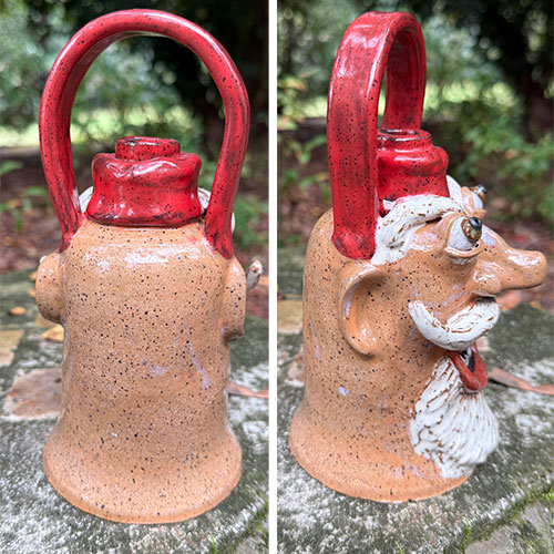 Jackie's heads are full of personality! This one is 8" tall to top of handle, about 5" wide and has a 3.5" base.