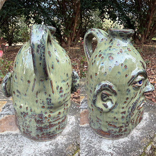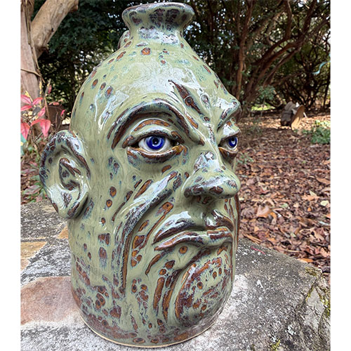 This face jug by Georgia potter Lolly Lynn Walton presents a restrained yet expressive interpretation of the Southern face vessel tradition. The form is compact and deliberate, with a narrow collar opening and strong frontal composition. Walton’s use of a layered green glaze, punctuated by mottled iron spotting, creates a surface that feels both weathered and alive. The facial modeling is introspective rather than exaggerated—heavy-lidded eyes, a set jaw, and subtle asymmetry give the piece a quiet psychological presence. The glaze pools and breaks across the contours, emphasizing the sculptural planes of the face while allowing the clay body to breathe through.