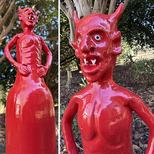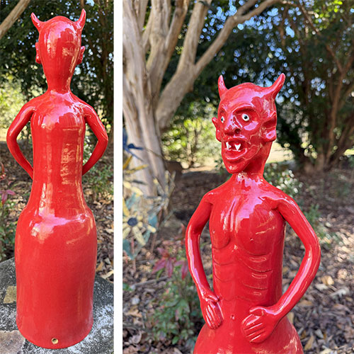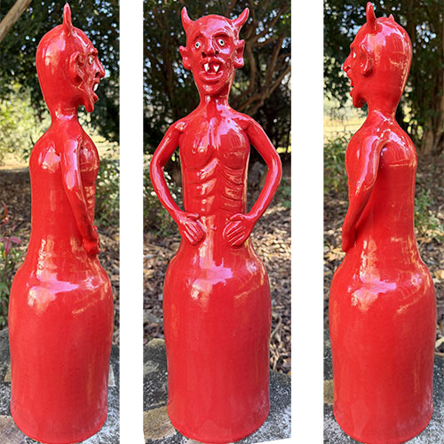 This red devil figural bottle is 21.5" tall, about 7.5" wide across the elbows and has a 6" base.