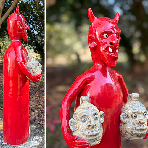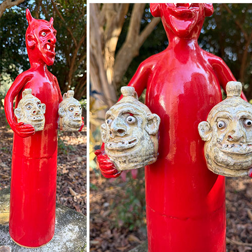 This red devil figural holding face jugs is 21.5" tall, about 8.5" wide and has a 4.75" base.