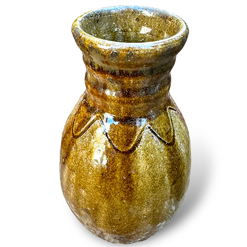 Measures 7.25" tall, 2.25" top opening and 2.75" base. It was wood fired in a kiln shared with Ben North in the fall of 2023 at the Lincoln County Community Kiln.