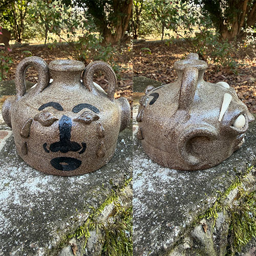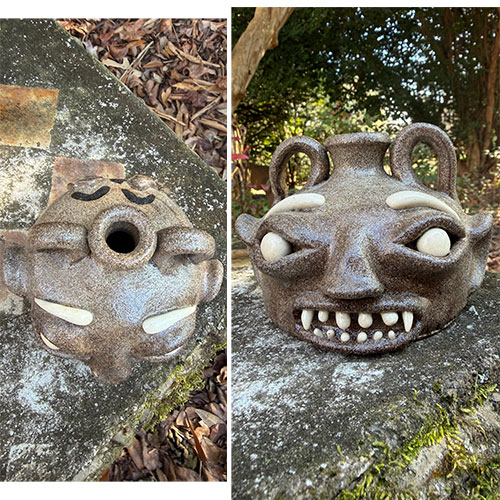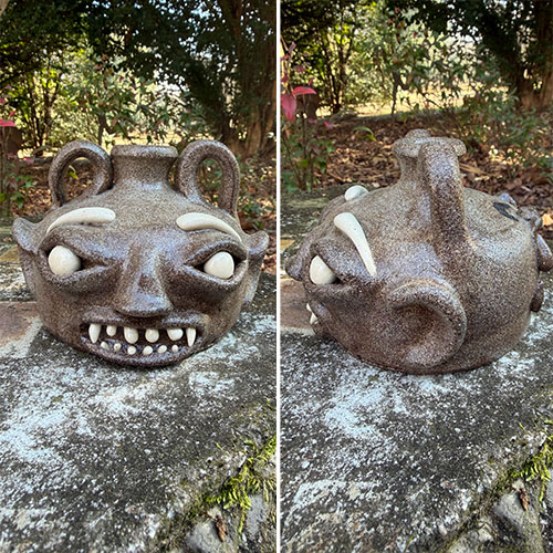 The front presents a mischievous, almost devilish expression—wide-set eyes, arched brows, and a toothy grin accented with pronounced fang-like teeth. Curled, horn-like handles rise from the shoulders, reinforcing the creature-like identity. In contrast, the reverse introduces a second narrative: a more solemn, stylized face rendered in dark slip, with tear-like markings and simplified features. This dual-sided composition creates a compelling push between humor and emotion, playfulness and introspection. The collaboration is evident in both the construction and surface—Gates’ expressive sculptural language paired with Sellars’ graphic, narrative-driven mark-making. A standout example of contemporary Southern folk pottery, this piece functions as both vessel and storytelling object, offering collectors a rare dual-authored work with strong visual impact from every angle.