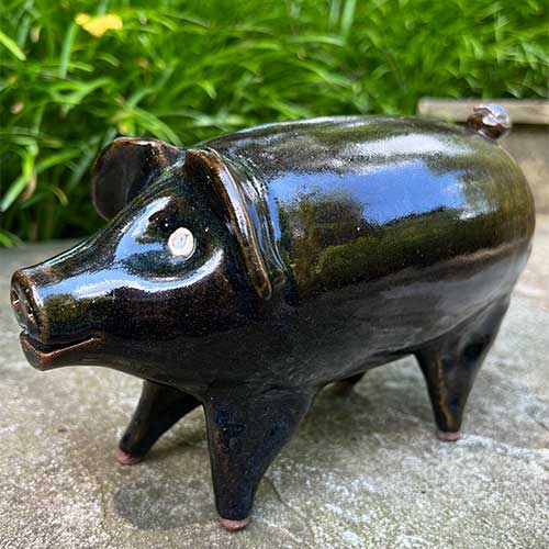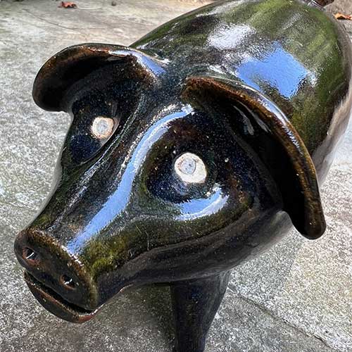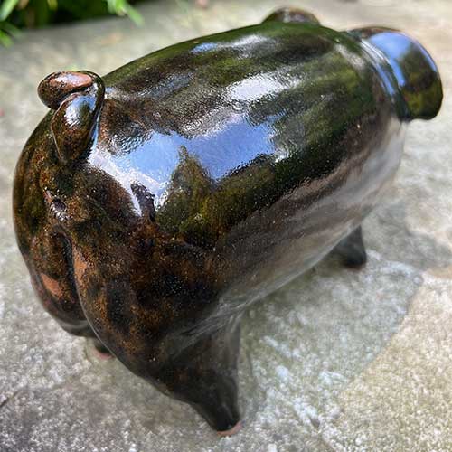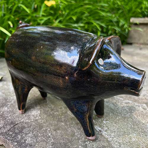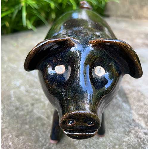 This pig is 5.75" tall, 9" from nose to tail and 2.75" across feet. The color is best represented in the outdoor photos.