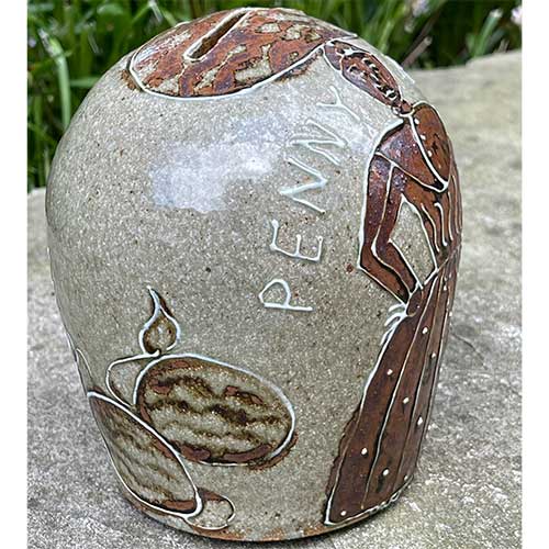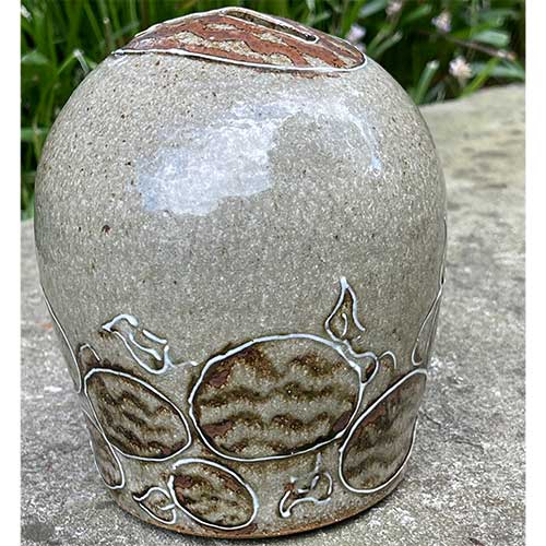 A class at the Greenville Museum of Art in 1977 prompted his initial attraction to pottery. The class was taught by Steve Ferrell, who later became an Edgefield master potter and historian. Michel continued to make pottery as a hobby throughout his working career. After surgery in 2003, and with the realization he would not be able to return to work, he decided to turn pottery into his occupation. He taught himself to make the basic forms and simple decoration. As his skill improved, his forms became much larger and his decoration much more ornate. Michel quickly attained proficiency at making large vessels and simultaneously took Edgefield decorative techniques to the next level. Adding to traditional slip trailing technique, Michel also creates detailed scenes with underglaze.
