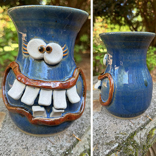 The work is made from stoneware and high-fired for a durable, usable product - functional quality with a fun twist of humor. Mugs are microwave and dishwasher safe - though do be careful when placing mugs in the dishwasher so they do not bump into each other - especially the teeth area.