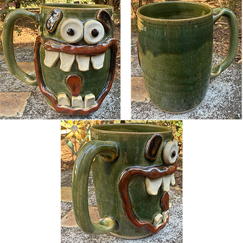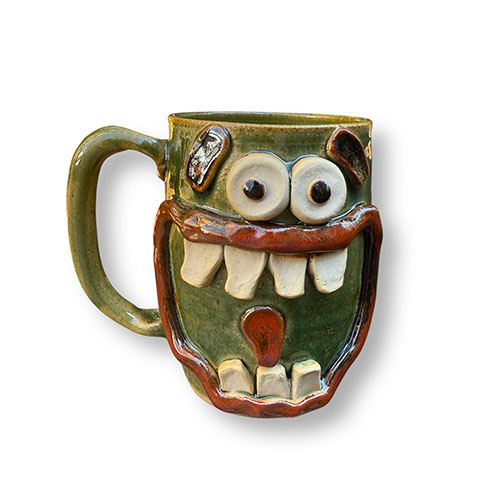 The work is made from stoneware and high-fired for a durable, usable product - functional quality with a fun twist of humor. Mugs are microwave and dishwasher safe - though do be careful when placing mugs in the dishwasher so they do not bump into each other - especially the teeth area.