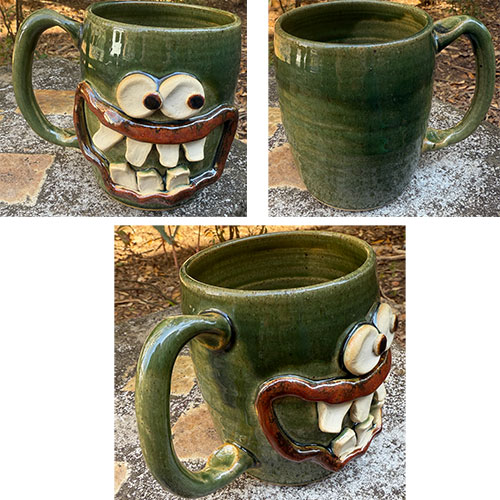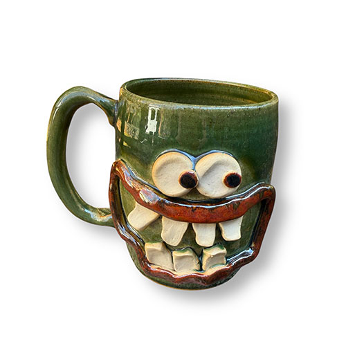 The work is made from stoneware and high-fired for a durable, usable product - functional quality with a fun twist of humor. Mugs are microwave and dishwasher safe - though do be careful when placing mugs in the dishwasher so they do not bump into each other - especially the teeth area.