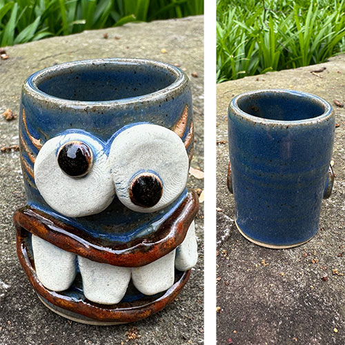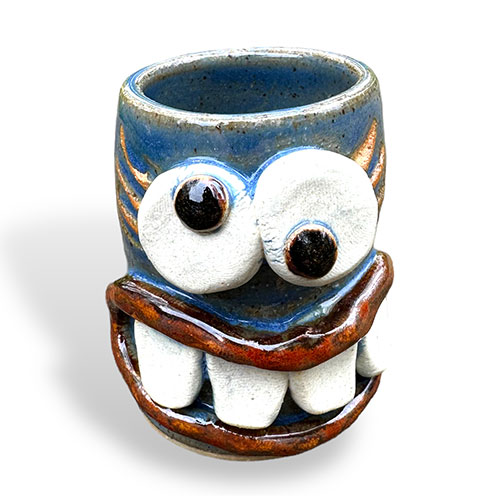The work is made from stoneware and high-fired for a durable, usable product - functional quality with a fun twist of humor. Mugs are microwave and dishwasher safe - though do be careful when placing mugs in the dishwasher so they do not bump into each other - especially the teeth area.