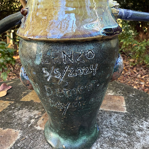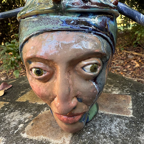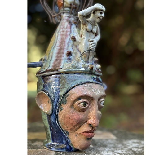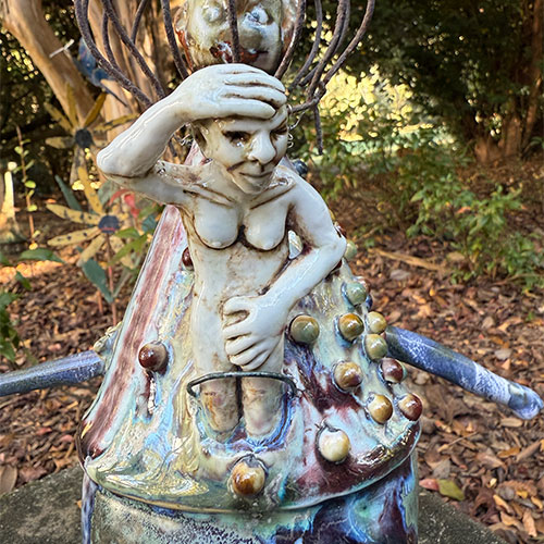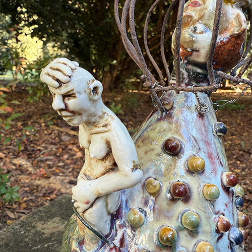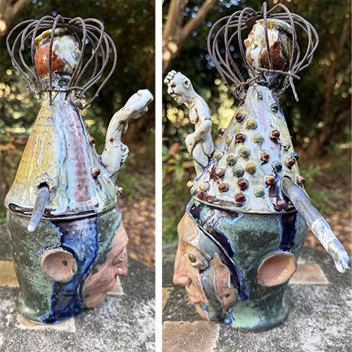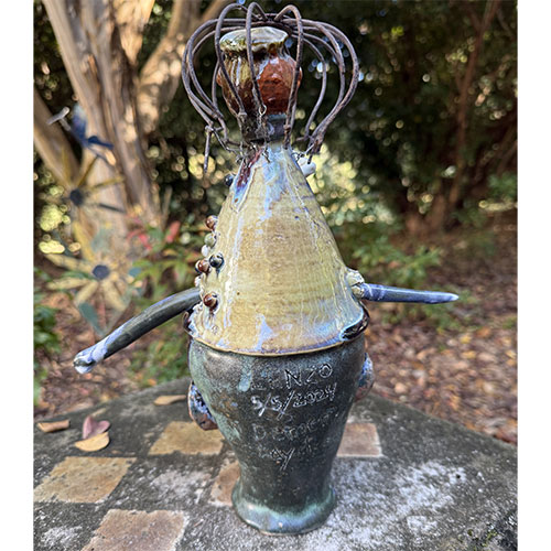 This piece is 12" tall and about 6" deep. The measurement across the "spear" is 10" And that spear is a huge reason as to why this is LOCAL PICK UP ONLY. It is dated 5/5/20245. Inscribed "Dementia Daydream."