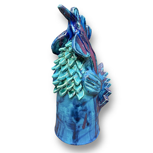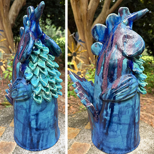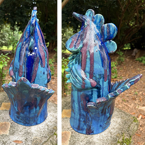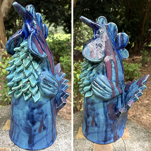 Direct from Randy Tobias, a potter for over 50 years. This big blue and turquoise rooster is 18" tall, 12" deep and has a 6.25" base.