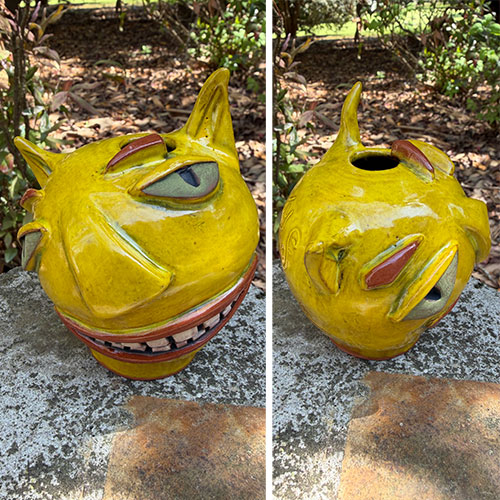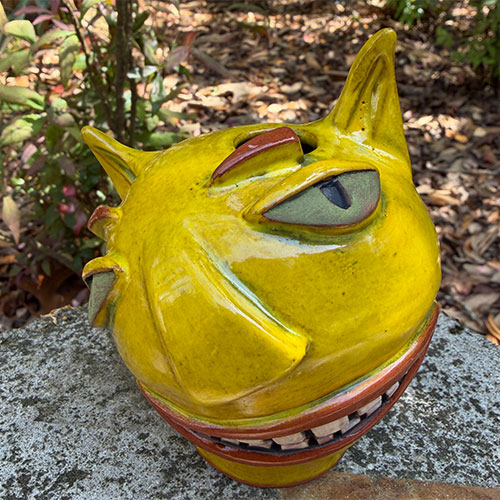 These ceramic cat face vessels by Ricky Boscarino embody the mischievous, theatrical spirit that defines his work at Luna Parc. Each piece is hand-built and highly expressive, featuring exaggerated feline features—arched brows, sly eyes, toothy grins, and animated contours that give every face a distinct personality.