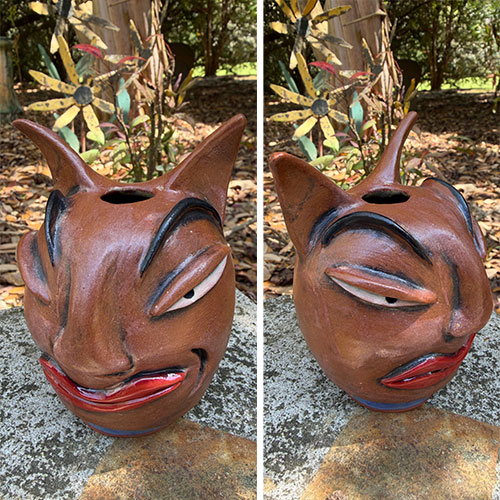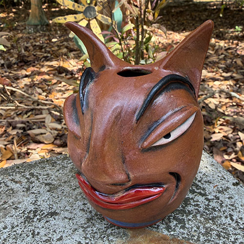 These ceramic cat face vessels by Ricky Boscarino embody the mischievous, theatrical spirit that defines his work at Luna Parc. Each piece is hand-built and highly expressive, featuring exaggerated feline features—arched brows, sly eyes, toothy grins, and animated contours that give every face a distinct personality.