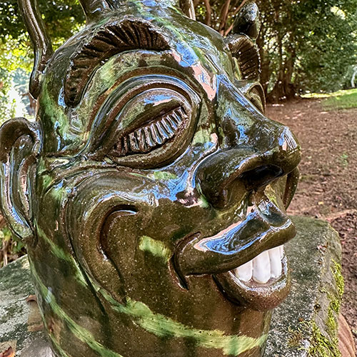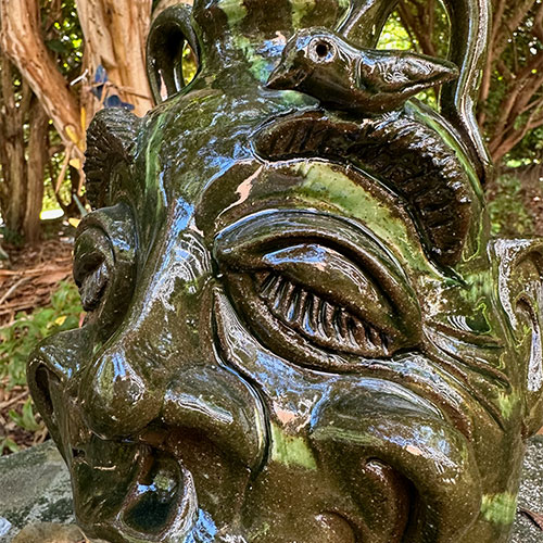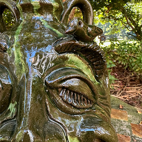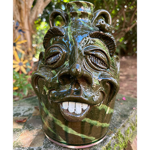 Traditional face jugs come in all shapes and sizes, manner of expressions, and often come in swirled, solid, or runny ash-glazed hues of brown, greens, or other colors. Robin Rodgers creates his face jugs on the potter’s wheel from both white and red clays. Once each piece has dried to a leather-hard stage, he begins sculpting the features - each piece with its own distinct personality. High fired to cone 5, or roughly 2200 degrees Fahrenheit.
