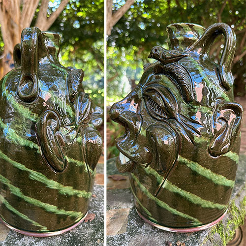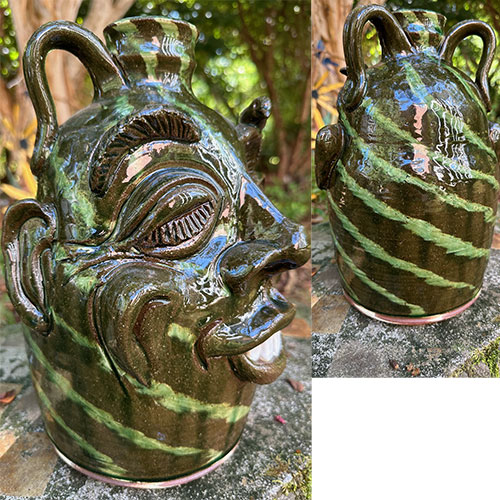 This green swirl double handled face jug is 12" tall with a 6.5" base. Note the little bird on his eyebrow.