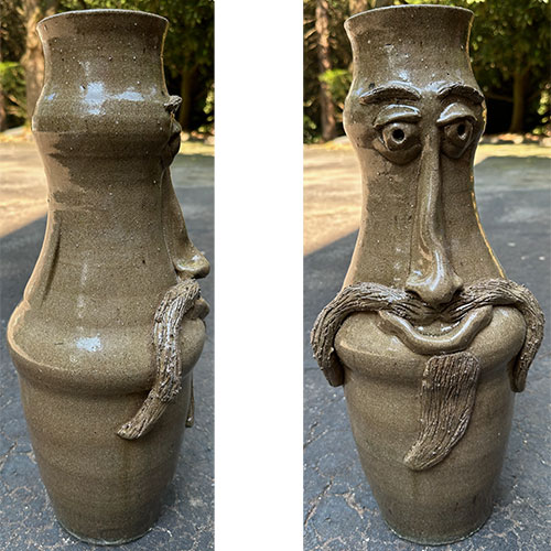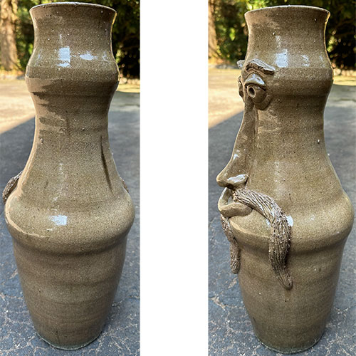 This face jug is 19" tall with a 4" base. Wood fired. The outside photos represent the color best. This is too tall to fit into our tallest box.