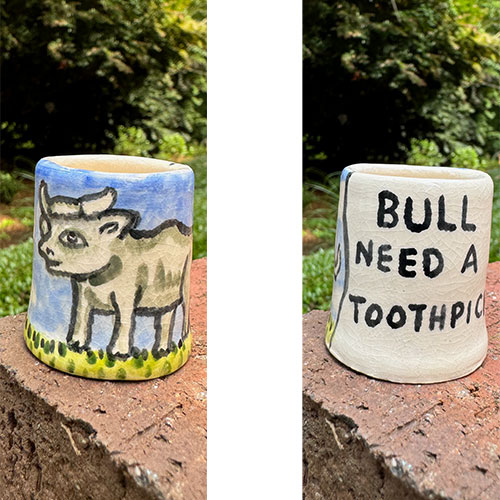 Stacy hand builds his figures, sometimes throwing part of the work on the wheel. He does an electric kiln bisque firing before completing the detail painting and finishing with a final electric firing. All of Stacy’s work is carefully constructed and abundantly detailed. His clay figures share characteristics with his amazing pen and ink and colored pencil drawings. Both clay and paper attest to Stacy Lambert’s imagination and creativity.