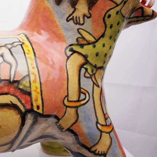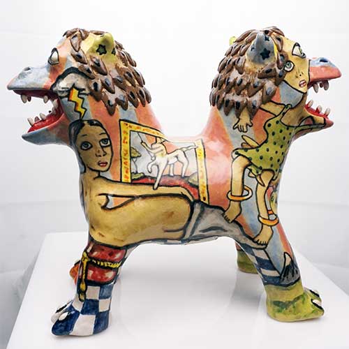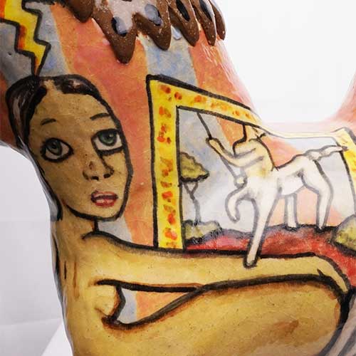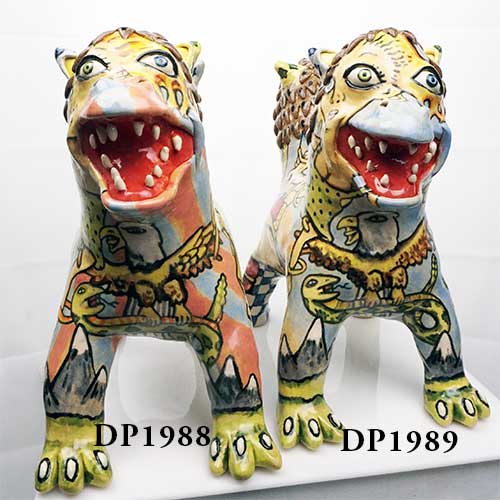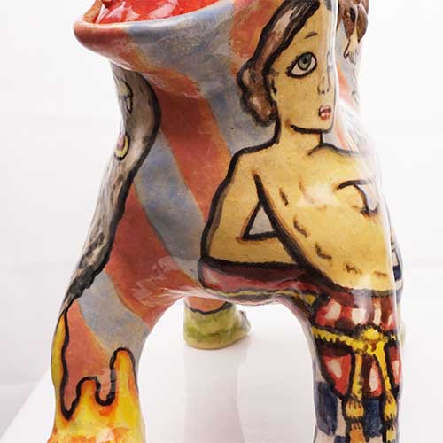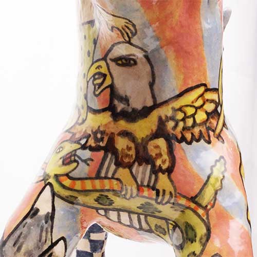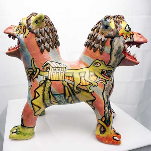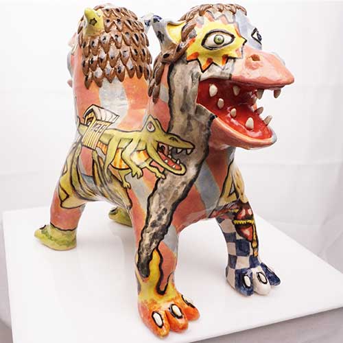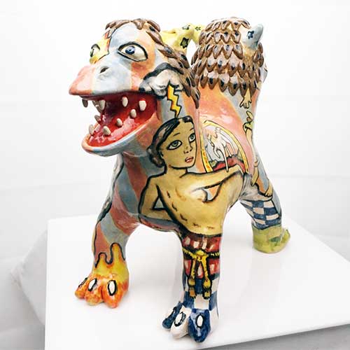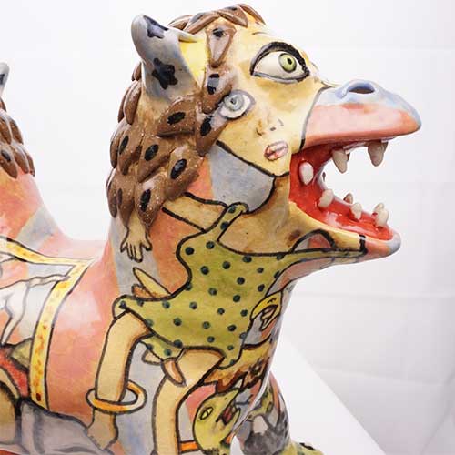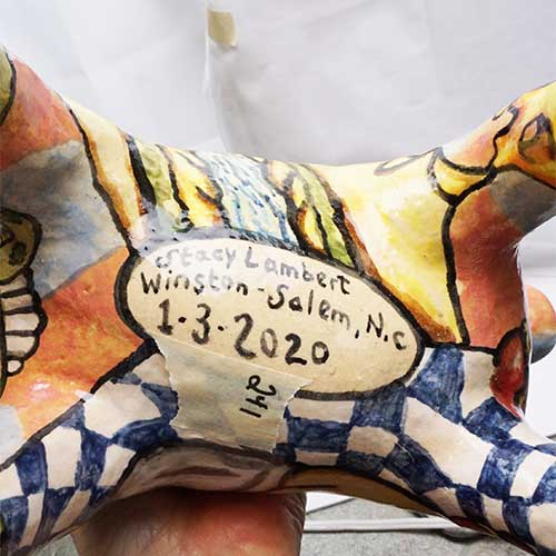 Stacy hand builds his figures, sometimes throwing part of the work on the wheel. He does an electric kiln bisque firing before completing the detail painting and finishing with a final electric firing. All of Stacy’s work is carefully constructed and abundantly detailed. His clay figures share characteristics with his amazing pen and ink and colored pencil drawings. Both clay and paper attest to Stacy Lambert’s imagination and creativity.