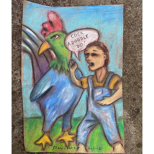 Stacy hand builds his figures, sometimes throwing part of the work on the wheel. He does an electric kiln bisque firing before completing the detail painting and finishing with a final electric firing. All of Stacy’s work is carefully constructed and abundantly detailed. His clay figures share characteristics with his amazing pen and ink and colored pencil drawings. Both clay and paper attest to Stacy Lambert’s imagination and creativity.