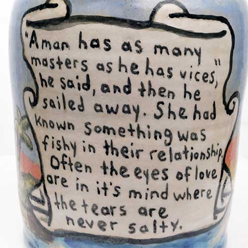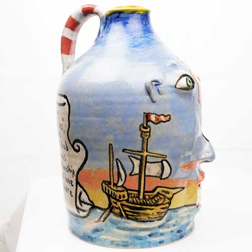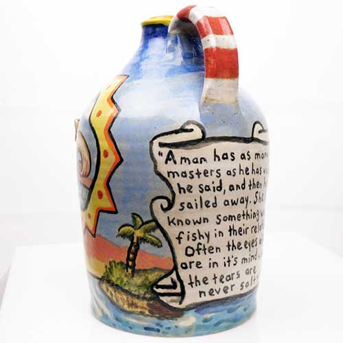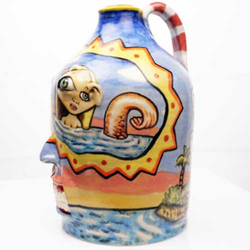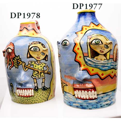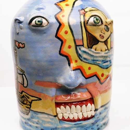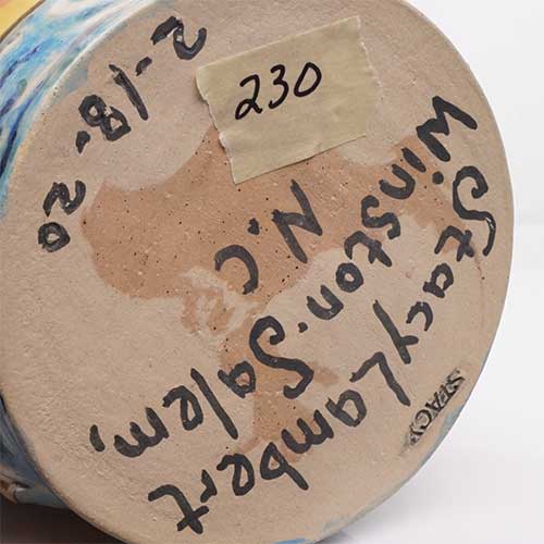 Stacy hand builds his figures, sometimes throwing part of the work on the wheel. He does an electric kiln bisque firing before completing the detail painting and finishing with a final electric firing. All of Stacy’s work is carefully constructed and abundantly detailed. His clay figures share characteristics with his amazing pen and ink and colored pencil drawings. Both clay and paper attest to Stacy Lambert’s imagination and creativity.