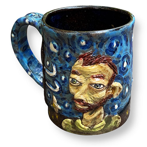 Stacy hand builds his figures, sometimes throwing part of the work on the wheel. He does an electric kiln bisque firing before completing the detail painting and finishing with a final electric firing. All of Stacy’s work is carefully constructed and abundantly detailed. His clay figures share characteristics with his amazing pen and ink and colored pencil drawings. Both clay and paper attest to Stacy Lambert’s imagination and creativity.
