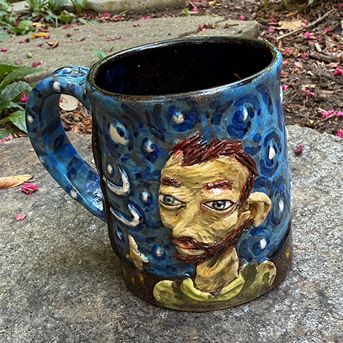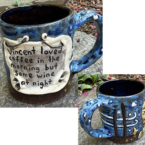 The Starry Night mugs are one of Stacy's best selling items. 3.75" tall, 3.25" top opening and 3.25" base.