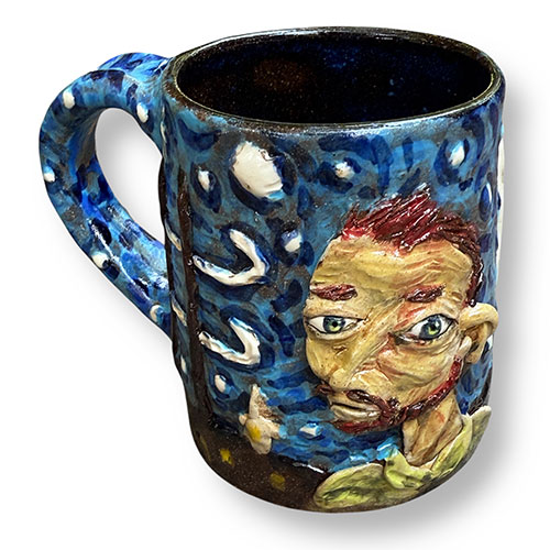 Stacy hand builds his figures, sometimes throwing part of the work on the wheel. He does an electric kiln bisque firing before completing the detail painting and finishing with a final electric firing. All of Stacy’s work is carefully constructed and abundantly detailed. His clay figures share characteristics with his amazing pen and ink and colored pencil drawings. Both clay and paper attest to Stacy Lambert’s imagination and creativity.