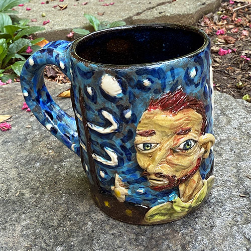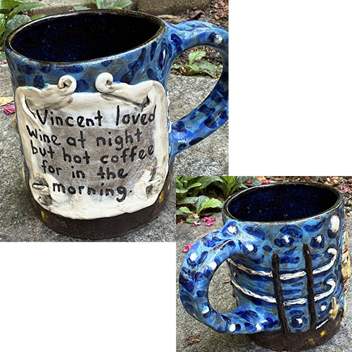 The Starry Night mugs are one of Stacy's best selling items. 3.75" tall, 3" top opening and 3.25" base.