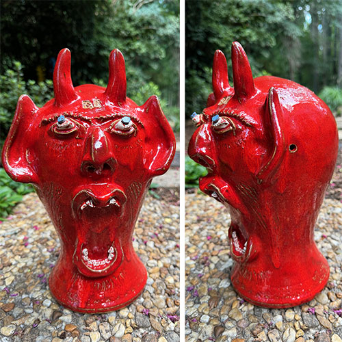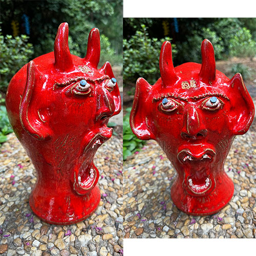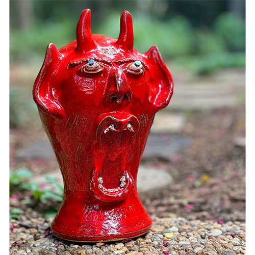 He’s created a certain look to his face jugs that is immediately recognizable. The well defined nose with flaring nostrils, white bulging eyes with cobalt pupils and the large gaping mouth with two rows of individually crafted white teeth that are part of Steve’s trademark look. Steve is well known for his beautiful swirl pieces using the swirl technique that’s such an important part of historic Catawba Valley pottery.